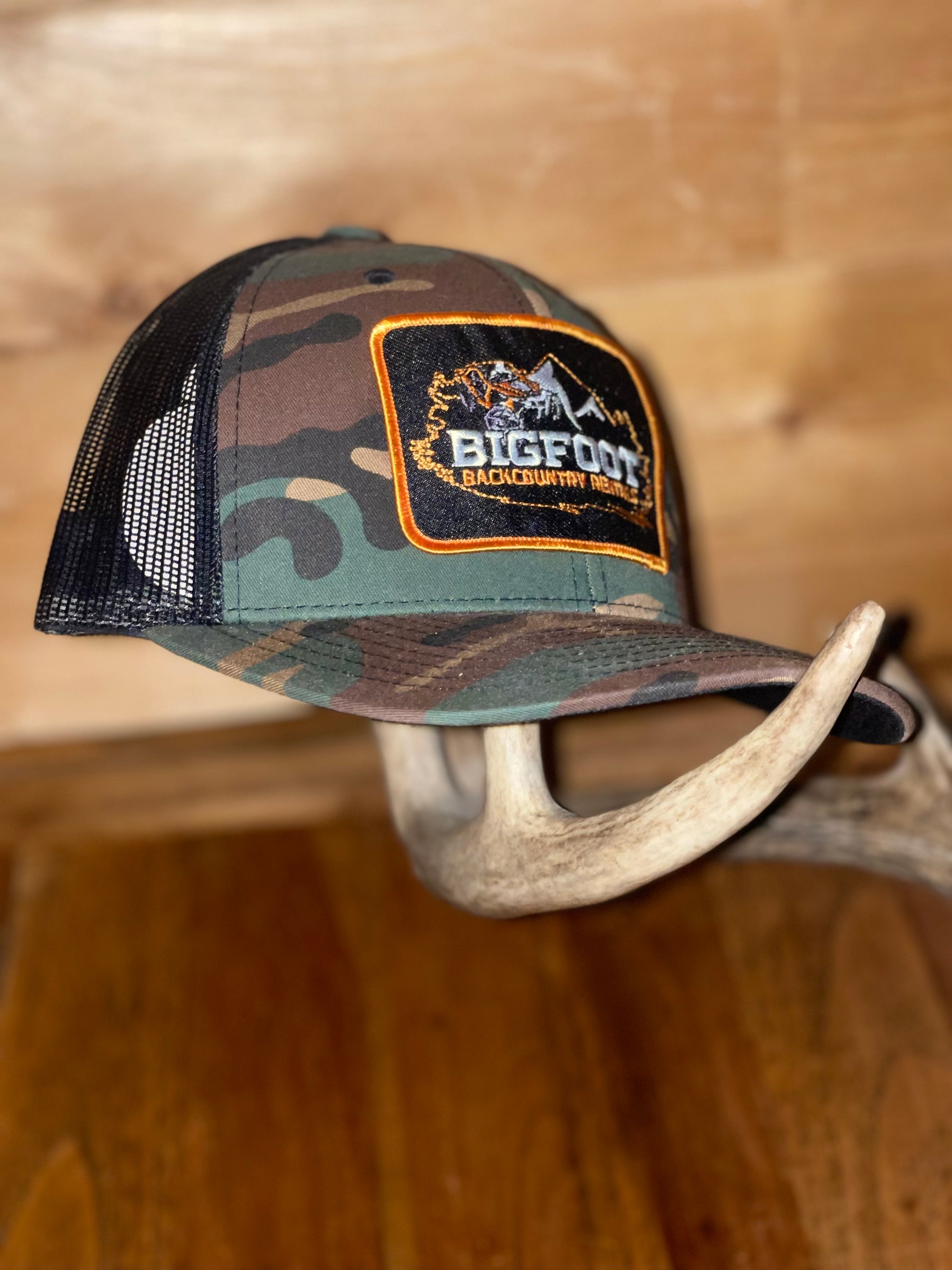 Green and brown camo SnapBack Bigfoot hat with orange, blue or green Bigfoot patch or leather Bigfoot patch